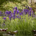 Lucious blue blooms rise above knife-like green foliage. Herbaceous perennial.